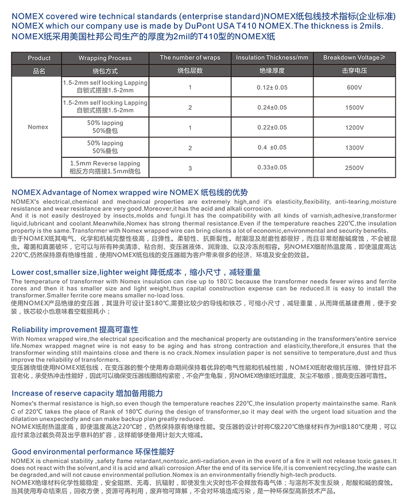 NOMEX Paper wrapped wire is extruded or drawn from oxygen free copper rod or electrician round aluminum rod with certainspecifications mould and then wrapped with T410 NOMEX which is made of DuPont,USA .t is widely applied in oil-immersedtransformer, welding machines and other similar electrical instruments,The extruded copperlaluminumiconductors are the besmaterial for NOMEX wrapped wire.